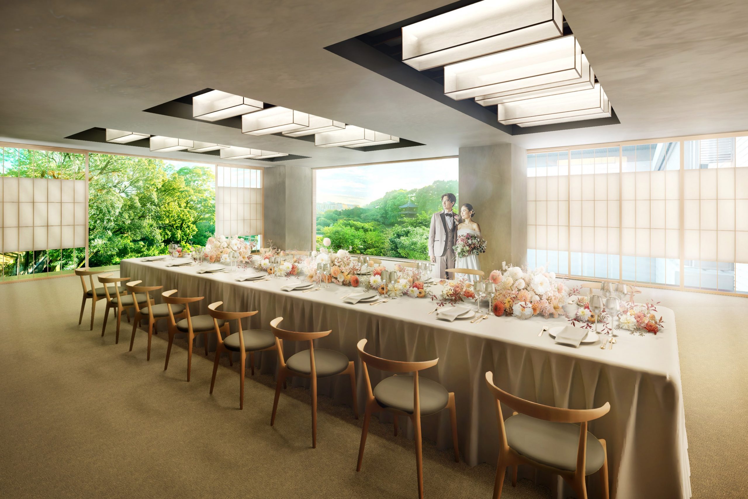 広大な庭園を望むホワイエを備え、ホテルでも随一の眺望を誇る人気バンケット「雅」は、緑を引き立たせるトーンでありながら、「雅」の名の通り、知的な優雅さも感じられる会場へと一新しました。